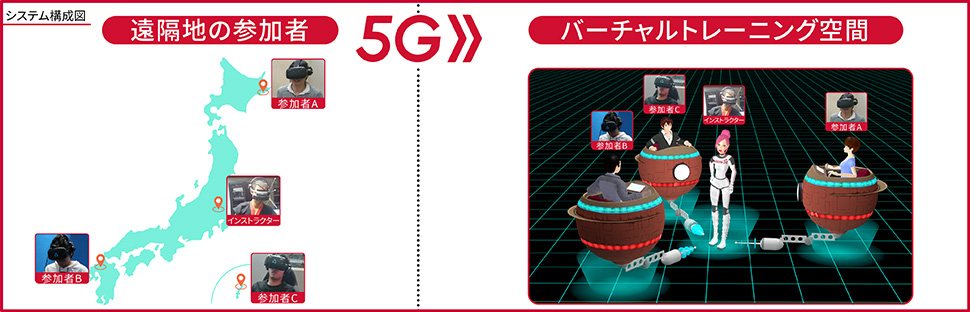 5Gで接続された遠隔地の参加者がインストラクターと同一のVR空間、CyberCityに集まり、アバターとしてコミュニケーションを取りながら、Space Fighterの操作方法を学び、模擬戦を行うことができます。